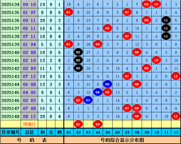 三少第2025149期体彩大乐透后区尾数分析:上期后区开出奖号08和12,为全2路尾数奖号,本期后区排除0路尾数号码,五码参考01、02、04、11、12。