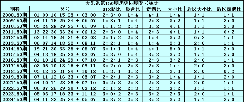 体彩大乐透第2025150期历史同期开奖号码分析: