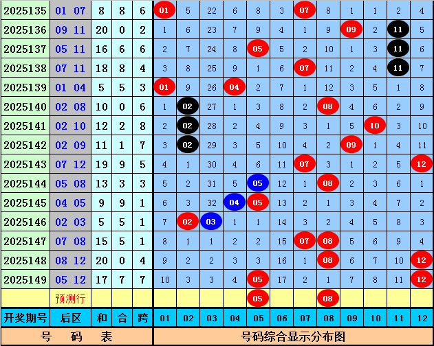 后区号码分析:第150期历史同期开奖中,后区两码一大一小开出9次,全大开出6次,全小开出1次,本期后区预计出现一大一小奖号,参考号码05、06、08、12。