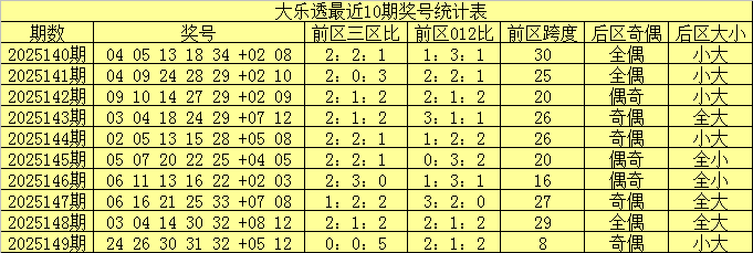 大乐透第2025149期奖号开出:24 26 30 31 32 +05 12。其中前区三区比为0:0:5,012路比为2:1:2,后区开出一大一小、一奇一偶奖号。