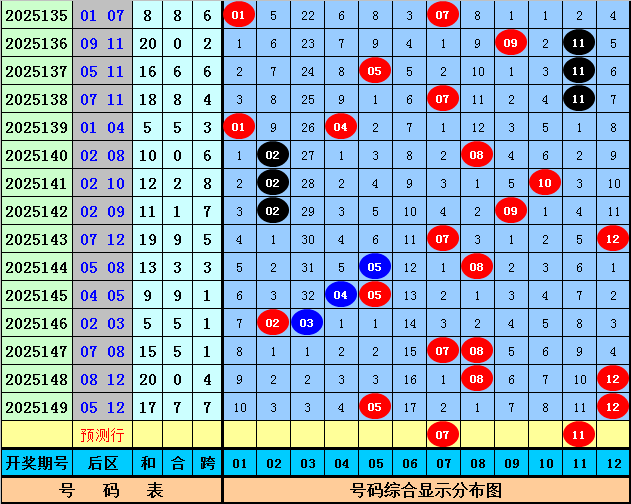 后区上期开出奖号05和12,该组合历史上出现了53次,其下期奖号频次分别为:号码09出现15次,11出现14次,02、06出现11次,05、10出现9次,01、12出现8次,04、07出现6次,03出现4次,08出现3次,本期后区参考号码01、07、09、11,精选两码07和11。
