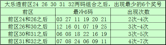 前区两码24和26开出之后,表现最冷的6个号码为:03、27、11、19、20、21;