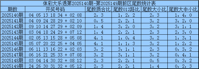 前区尾数大中小分析(大尾:7-9,中尾3-6,小尾0-2):上期奖尾号码大中小比为0:2:3,最近5期奖尾号码大中小个数比开出1:14:10,前10期奖尾号码大中小个数比为11:27:12,本期重防中尾号码热出,奖尾号码大中小比参考1:3:1。