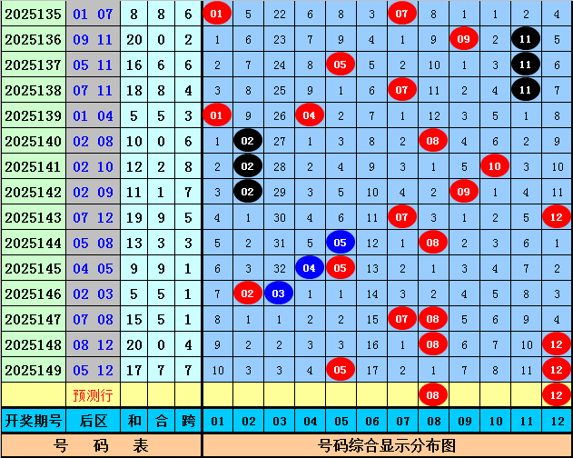 三少第2025150期体彩大乐透后区尾数分析:上期后区开出奖号05和12,为全2路尾数奖号,本期后区排除1路尾数号码,五码参考02、03、07、08、12。