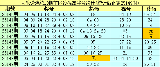 大乐透第25140期-第25149期前区奖号冷温热分布统计: