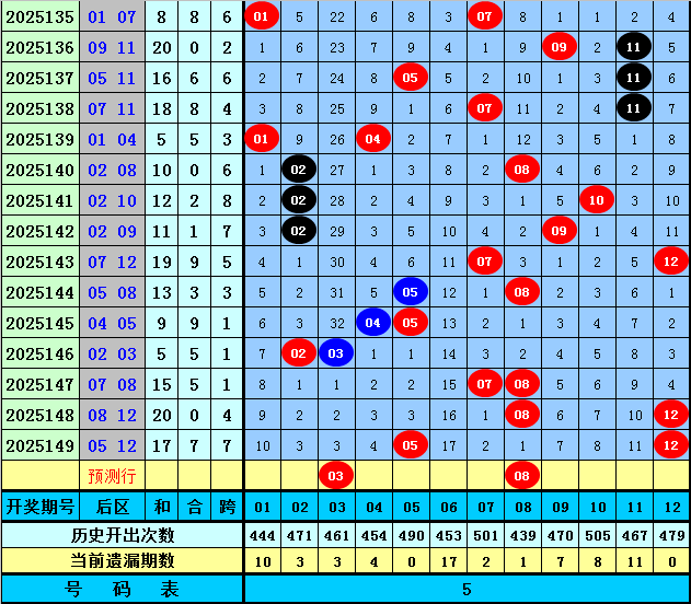 后区分析【一区01-04,二区05-08,三区09-12】:上期后区奖号为05和12,分别落在第二、三区,近50期后区三区比为30:38:32,近10期三区比为6:9:5,本期注意第一、二区号码出现,关注两码03+08。