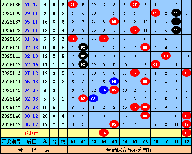 后区分析:上期后区开出号码05和12,在最近15期开奖中,后区奖号奇偶比为16:14,大小比为17:13,本期后区关注全偶组合和一大一小组合,精选两码04和12。