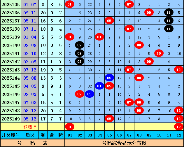 后区号码分析:上期后区开出奖号05 12,和值为17,跨度为7,本期后区参考号码01、02、05、10、12。