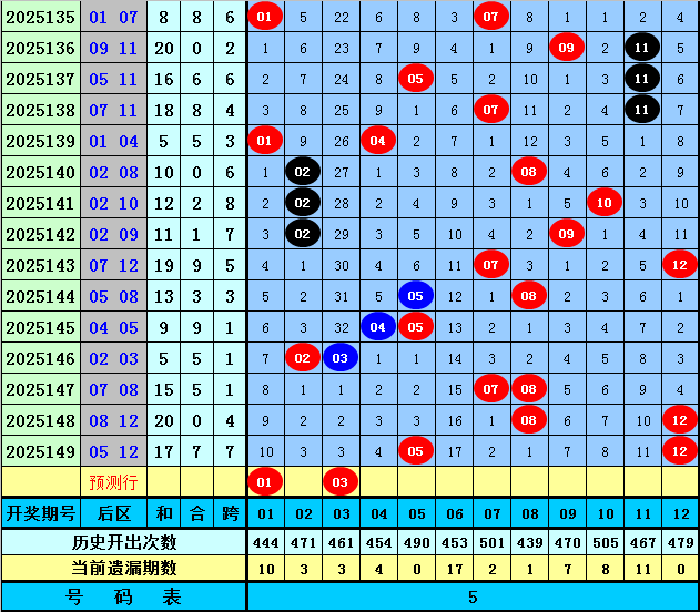 后区分析:在第150期历史同期开奖中,后区奖号奇偶比为21:11,最近5年同期后区奇偶走势为:全奇、一奇一偶、一奇一偶、一奇一偶、全奇,今年同期预计再出全奇组合,参考号码01、03。