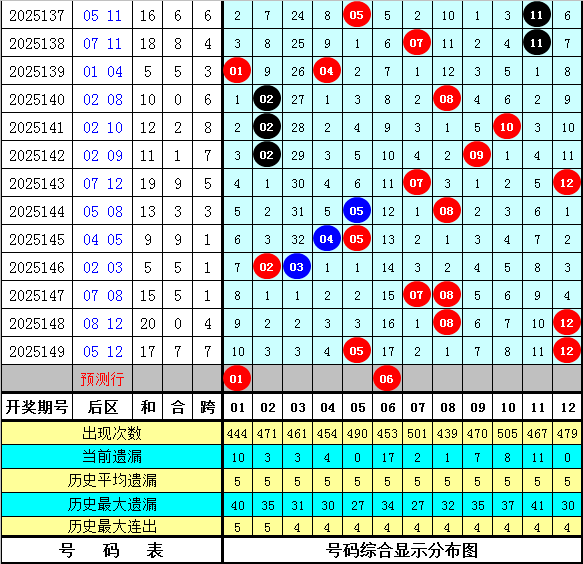 在历史同期开奖中,后区号码和值奇偶为7:9,其中奇号和值出现相对较少,本期适当关注奇号和值回补,参考和值7。