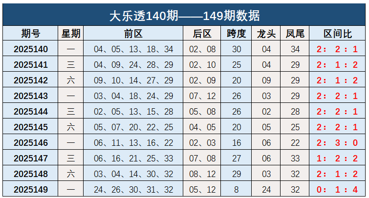 大乐透第2025149期出奖号统计:前区24、26、30、31、32,后区05、12。前区跨度8,龙头24,凤尾32,区间比比0:1:4。