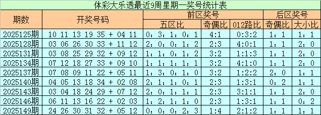上期回顾:体彩大乐透上周星期一(第2025149期)奖号为24 26 30 31 32 + 05 12,前区奖号五区比为0:0:0:2:3,奇偶比为1:4,012路比为2:1:2,后区奖号奇偶比为1:1,大小比为1:1。