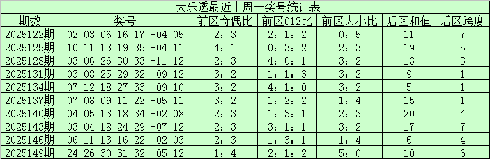 前区大小走势:上期前区大小比为3:2,上周一号码大小比5:0,最近十周一小 号略占优势,本期预计小 号再次走热,参考大小比2:3。