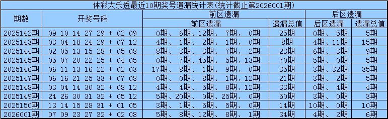 体彩大乐透第2026001期开奖回顾:前区奖号:07、09、23、27、32,后区奖号02、08,前区前各位遗漏:5期、8期、12期、8期、1期,遗漏总值34期,后区各位遗漏4期和2,遗漏总值 6期。