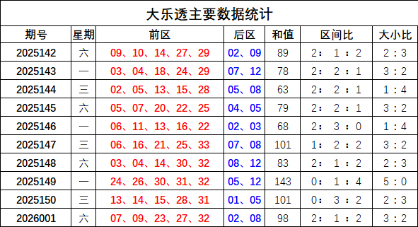 上期回顾:大乐透上期奖号为:前区07 09 23 27 32,后区02 08,前区奖号和值为98,区间比2:1:2,大小比为3:2,