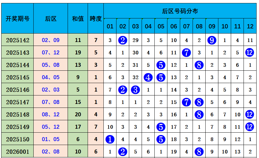 近10期开出0路号码5枚,1路号码4枚,2路号码11枚;上期开出2路号码02、08。结合分析,本期关注0路、1路号码热出,后区两码参考:01、06。