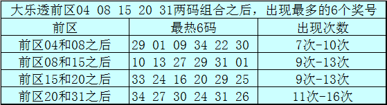 前区两码20和31和之后表现最热的6个号码为:34、27、30、24、31、26;