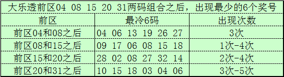 前区冷码统计:大乐透第26002期前区奖号为:04、08、15、20、31,截止第26002期历史上大乐透已经开出了2820期奖号了,在连续两码奖号中: