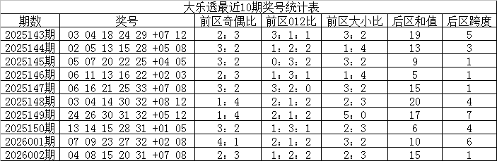 012路分析:上期前区奖号012路比为1:2:2,最近两周0路前区奖号走势较热,2路前区奖号表现较冷。