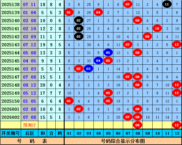 后区分析:上期后区开出两码07和08,分别遗漏了4期和0期,最近10期后区奖号大小个数比为11:9,奇偶个数比为9:11,本期后区注意号码03、08、10、11、12,精选两码08、12。