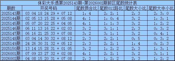 体彩大乐透第2026002期开奖号码为:04 08 15 20 31 + 07 08其中前区奖号奇偶比为2:3,大小比为2:3,012路为1:2:2,前区尾数质合比为2:3,012路比为1:2:2,大小比为2:3,大中小比1:2:2。