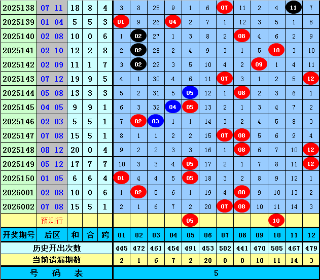 后区第一位推荐:在连续5期开奖中分别出号:08、05、01、02、07,均值为4.6,其中奇数奖号表现相对较热,本期没有转冷的迹象,注意再次出现,关注号码05。