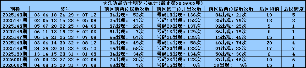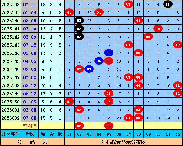 后区奖号分析:上期后区开出奖号07+08,奖号和值为15,跨度为1,本期预计后区和值转小,关注两码02 05。