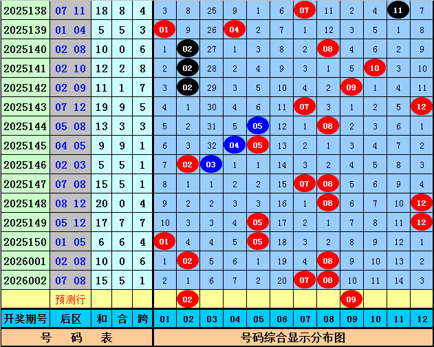 后区分析:上期该位开出奖号07和08,和值为15,跨度为1,后区前4次开出和值15和跨度1时,其下期奖号分别为:07+11、07+10、02+05、08+12,号码奇偶比为4:4,大小比为6:2,012路比为1:3:4,本期后区号码参考01、02、09、10、11,精选两码02、09。
