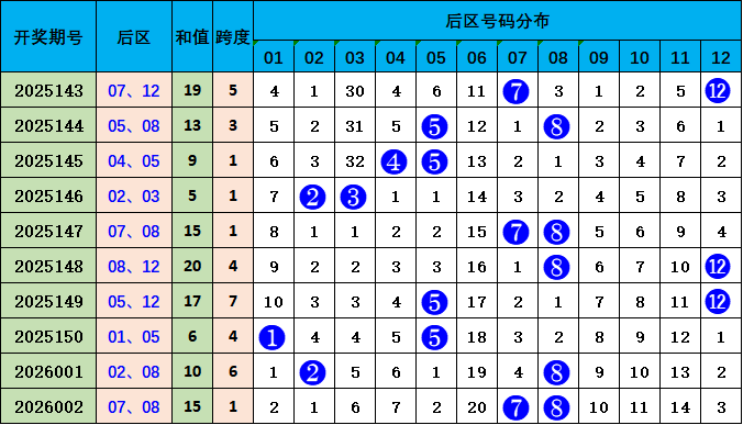 后区走势分析:上期开出07 08,开出和值15,较前一期和值上升5个点位变化,本期预测和值下降,参考号码04 10,和值14。