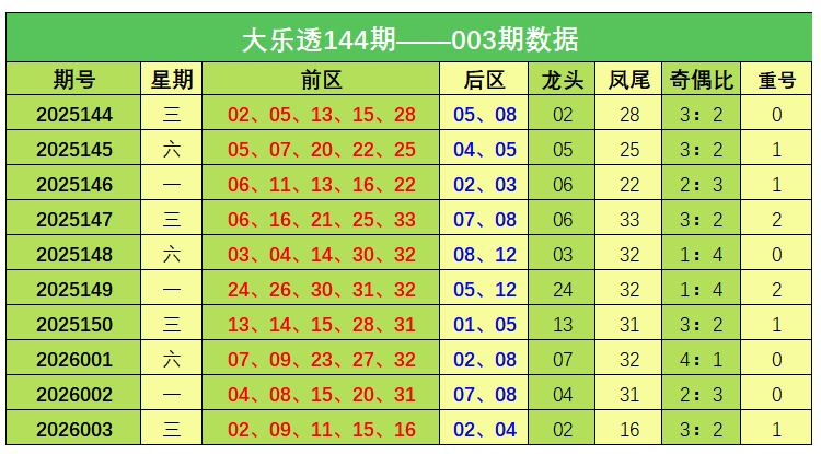 大乐透第2026003期出奖号统计:前区05、09、11、15、16,后区02、04。龙头02,凤尾16,奇偶比3:2,开出1枚重号。