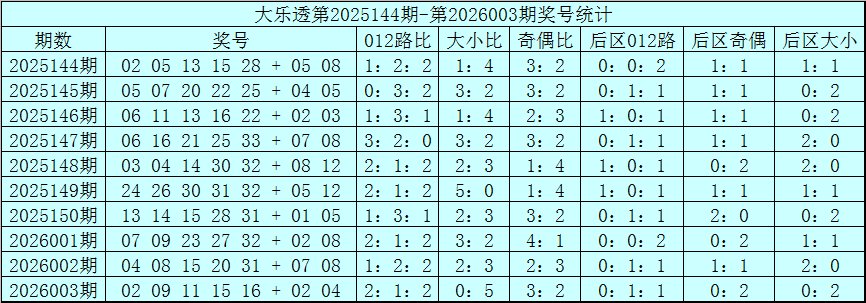体彩大乐透第26003期奖号为:02 09 11 15 16+02 04,前区奖号012路比为2:1:2,奇偶比为3:2,大小比为0:5,后区0路号码轮空。