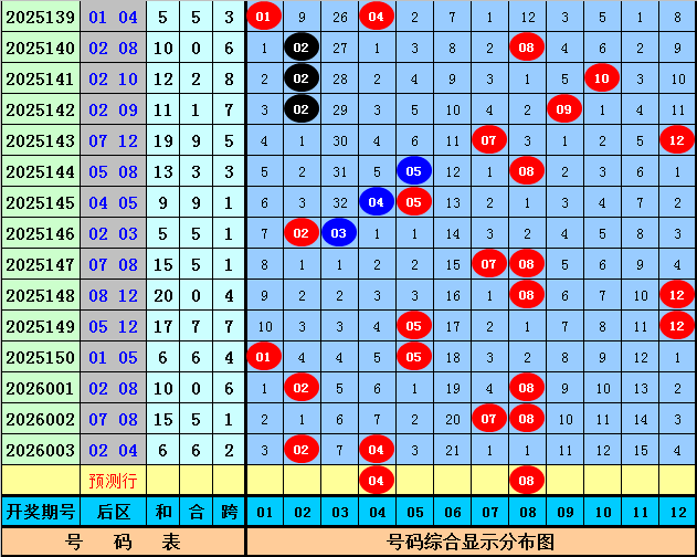 后区分析:上期后区开出号码02和04,最近10期后区奖号奇偶比为8:12,大小比为9:11,本期后区看好号码03、04、06、08、11,后区单挑两码04、08。