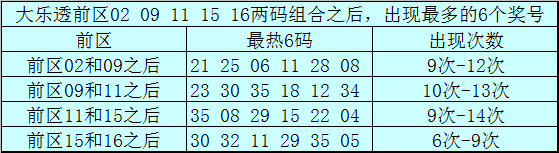 前区两码02和09和之后表现最热的6个号码为:21、25、06、11、28、08;