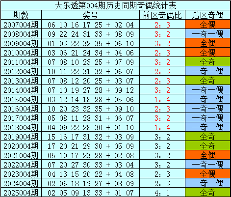后区分析:在第004期历史同期开奖中,后区奖号奇偶比为19:19,最近5年同期后区奇偶走势为:全偶、一奇一偶、全偶、一奇一偶、全奇,今年同期预计再出全奇组合,参考号码05、09。
