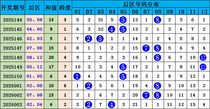 前区热号分析(0-3):上期热号出现在第一、二区,开出2个09、15,热码出号相对一般;最近8期热号有16个,热号出号相对较多。本期热码参考13、28。