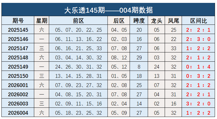 大乐透第2026004期出奖号统计:前区05、18、23、25、32,后区05、09。前区跨度27,龙头05,凤尾32,区间比比1:2:2。