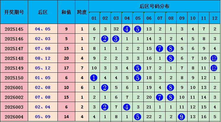 上期后区开出号码05 09,和值14,近十期和值9 5 15 20 17 6 10 15 6 14,和值波动范围较大,本期预测和值会持平,重点关注号码:03 11,和值14。