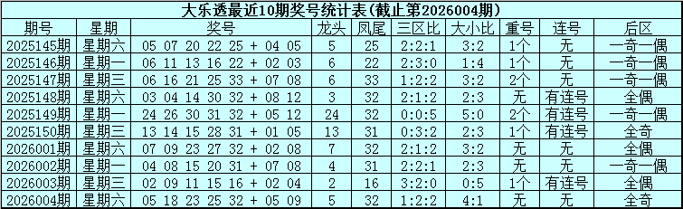 大乐透第2026004期奖号为:05、18、23、25、32+05、09。其中前区三区比为1:2:2,大小比为4:1,没有出现重号,没有出现连号,后区为全奇号码。