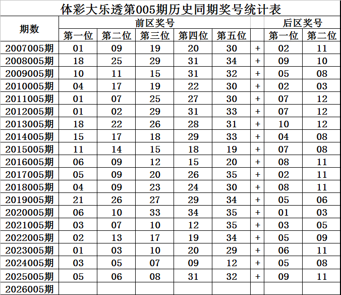 体彩大乐透第2026004期奖号为:05 18 23 25 32 + 05 09,前区号码和值为103,跨度为27,后区号码和值为14,跨度为4。