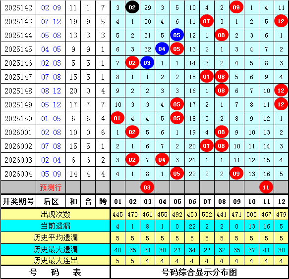 上期回顾:体彩大乐透第2026004期开出号码:05 18 23 25 32 + 05 09,其中前区奖号尾数奇偶比为3:2,大小比为3:2,012路比为1:0:4,大中小比为1:3:1,后区奖号尾数奇偶比为2:0,大小比为2:0。