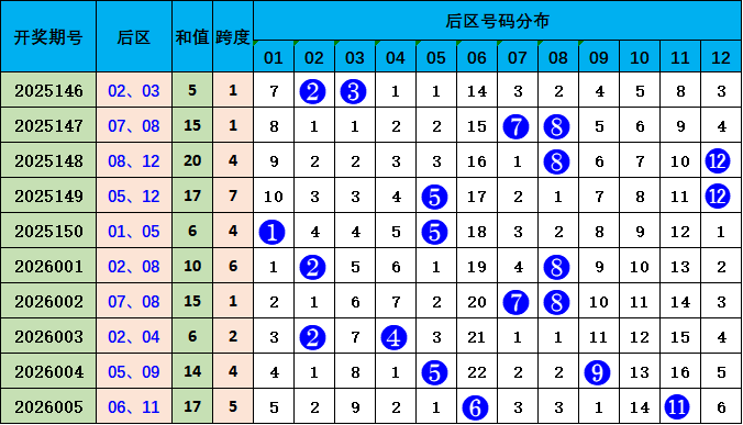 后区综合分析:上期开出后区号码:06 11,跨度5,较前一期相比跨度上升1个点位。本期预测跨度值下降,推荐号码:05 09,跨度4。