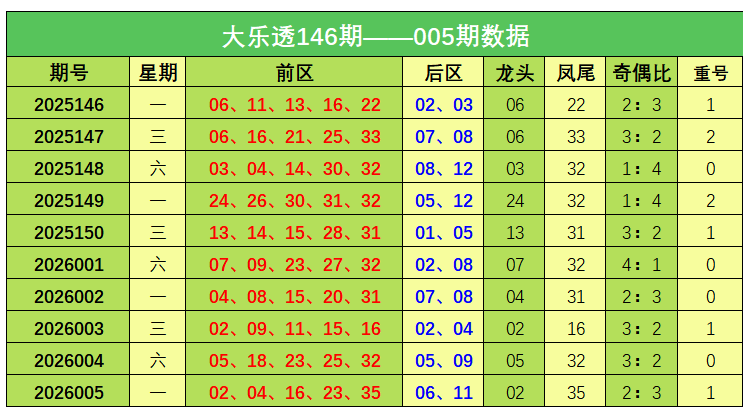 大乐透第2026005期出奖号统计:前区02、04、16、23、35,后区06、11。龙头02,凤尾35,奇偶比2:3,开出1枚重号。