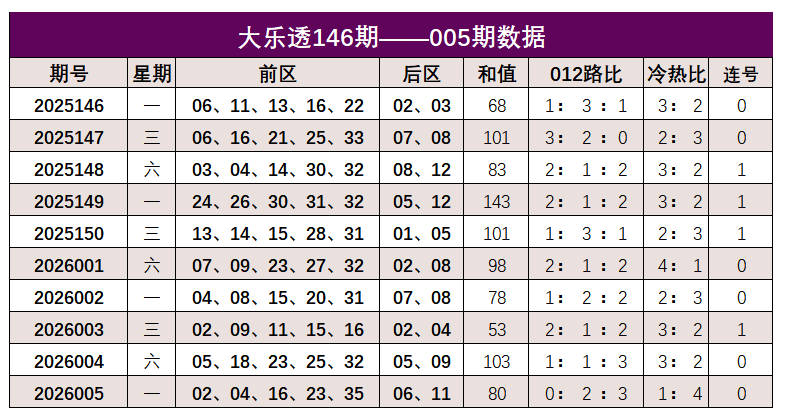 大乐透第2026005期出奖号统计:前区02、04、16、23、35,后区06、11。和值80,012路比0:2:3,冷热比1:4,未开出连号。
