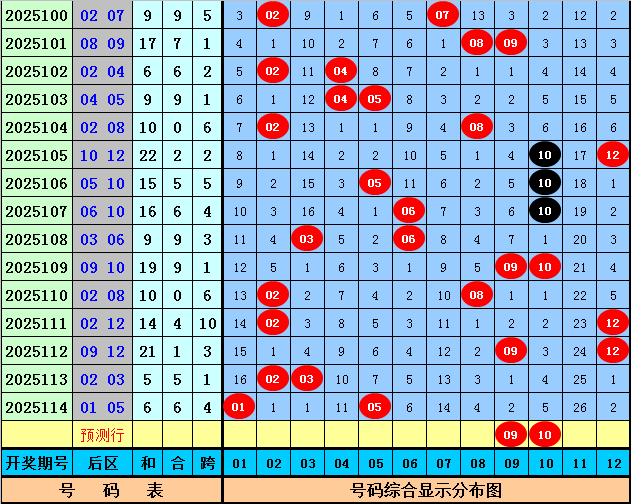 后区号码分析:在第115期历史同期开奖中奖,奖号02 06 08 10出现4次,奖号03 09 11 12出现3次,奖号01 05出现2次,奖号04 07出现1次。本期后区五码参考01、05、09、10、11。