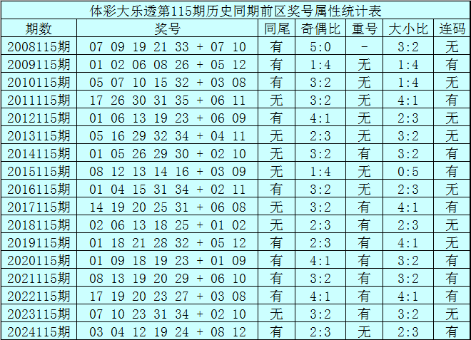 体彩大乐透第115期历史同期开出17次奖号,其统计详见下表: