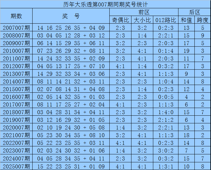 袁军师体彩大乐透第2026007期历史同期奖号分析: