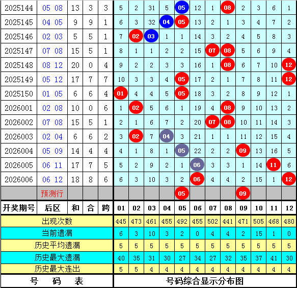 上期回顾:体彩大乐透第2026006期开出号码:05 12 18 23 35 + 06 12,其中前区奖号尾数奇偶比为3:2,大小比为3:2,012路比为1:0:4,大中小比为1:3:1,后区奖号尾数奇偶比为0:2,大小比为1:1。