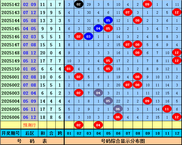 后区分析:上期该位开出奖号06和12,和值为18,跨度为6,后区前4次开出和值18和跨度6时,其下期奖号分别为:05+06、03+09、04+07、01+02,号码奇偶比为5:3,大小比为2:6,012路比为3:3:2,本期后区号码参考02、04、06、08、11,精选两码02、04。