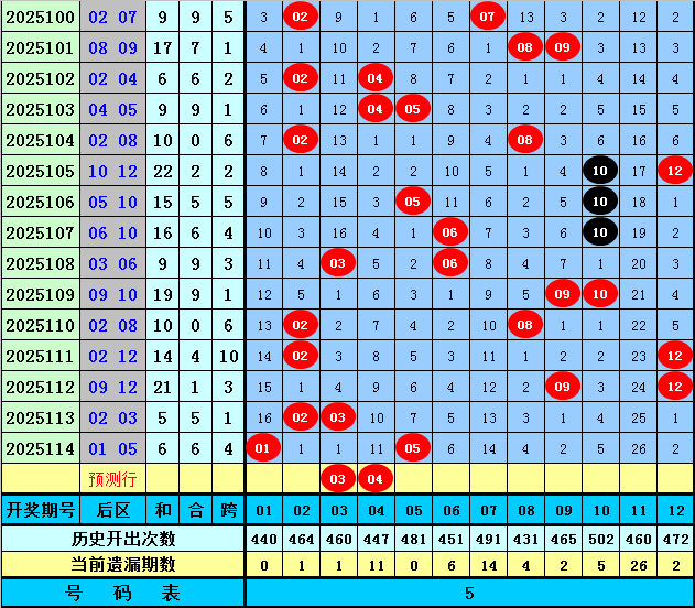 后区分析:上期后区奖号为01和05,最近5期后区和值分别为10、14、21、5、6,后区跨度分布范围在1-10,本期后区注意两码03、04。