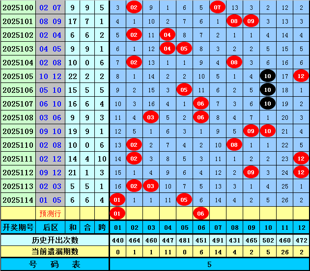 后区分析:上期后区开出全小组合:01+05,最近10期后区奖号大小比为10:10,本期防全小组合再出,参考两码01、06。